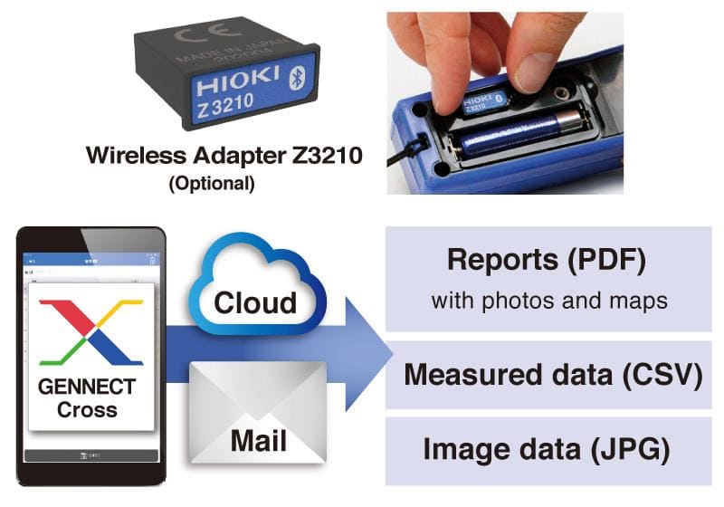 Легко! Просто подключите дополнительный беспроводной адаптер Z3210 к вашему совместимому с Hioki инструменту, чтобы сделать его готовым к Bluetooth®.