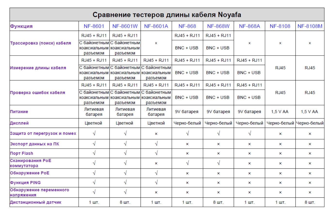 В модели NF-8601W в комплект входят восемь дистанционных датчиков для удобства работы и сокращения времени наладки сети. Предназначен для применения в таких областях, как телефонные системы, компьютерные сети и в других сетях медными/металлическими проводниками.