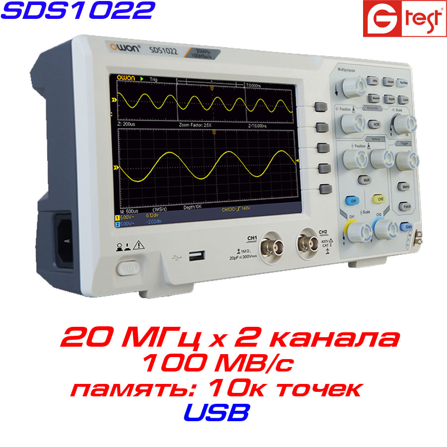 OWON SDS1022 2-x канальний недорогий осцилограф, виробництва компанії OWON, володіє пропускною здатністю 20 МГц, вибіркою 100 МВ / с, об'ємом пам'яті 10к точок.