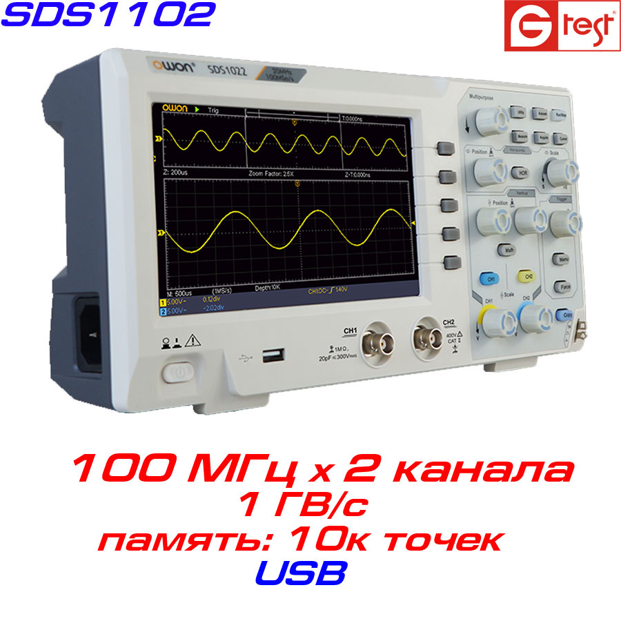 OWON SDS1102 2-x канальний недорогий осцилограф, виробництва компанії OWON, володіє пропускною здатністю 100 МГц, вибіркою 100 МВ / с, об'ємом пам'яті 10к точок.