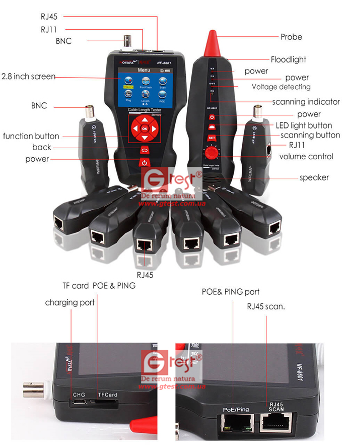 NF-8601W является многофункциональным кабельным тестером предназначенным для измерения перекрёстных помех, трассировки кабеля, определения длины кабеля, выполнения PING и POE - тестов. Результаты отображаются на большом цветном дисплее 3.7 дюйма (94 мм).
