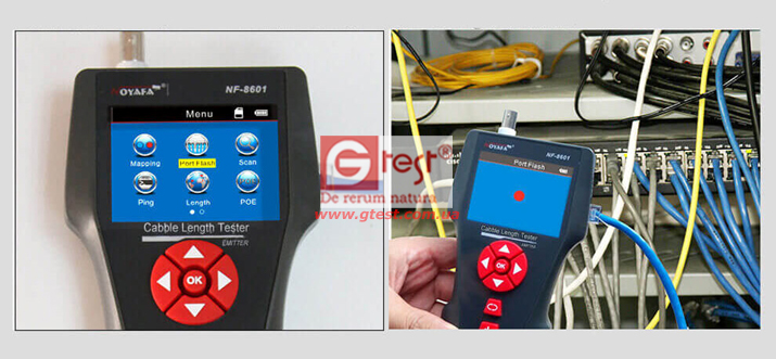 • Локатор портов Ethernet: быстро идентифицирует порты с помощью мигающего индикатора, генерируемого NF-8601W. Прибор быстро находит целевой порт и кабель на маршрутизаторе или коммутаторе, даже среди беспорядочных и связанных кабелей.