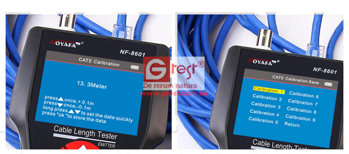 Поскольку материалы кабелей различаются, тестирование длины кабеля может отличаться. Итак, нам необходимо откалибровать кабель. Используйте кабель длиной более 10 метров, затем войдите в функцию калибровки для измерения длины. Когда появится результат, то сохраняем данные на приборе. Данные можно будет загрузить, пока в следующий раз будет измеряться длина.
