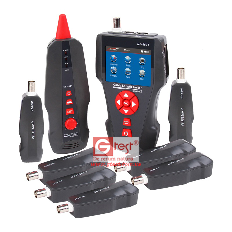 Комплект оборудования включает три компонента: основной тестер (NF-8601-M), приёмник (NF-8601-S) и дистанционный датчик (NF-8601-R). В модели NF-8601W в комплект входят восемь дистанционных датчиков для удобства работы и сокращения времени наладки сети. Предназначен для применения в таких областях, как телефонные системы, компьютерные сети и в других сетях медными/металлическими проводниками.