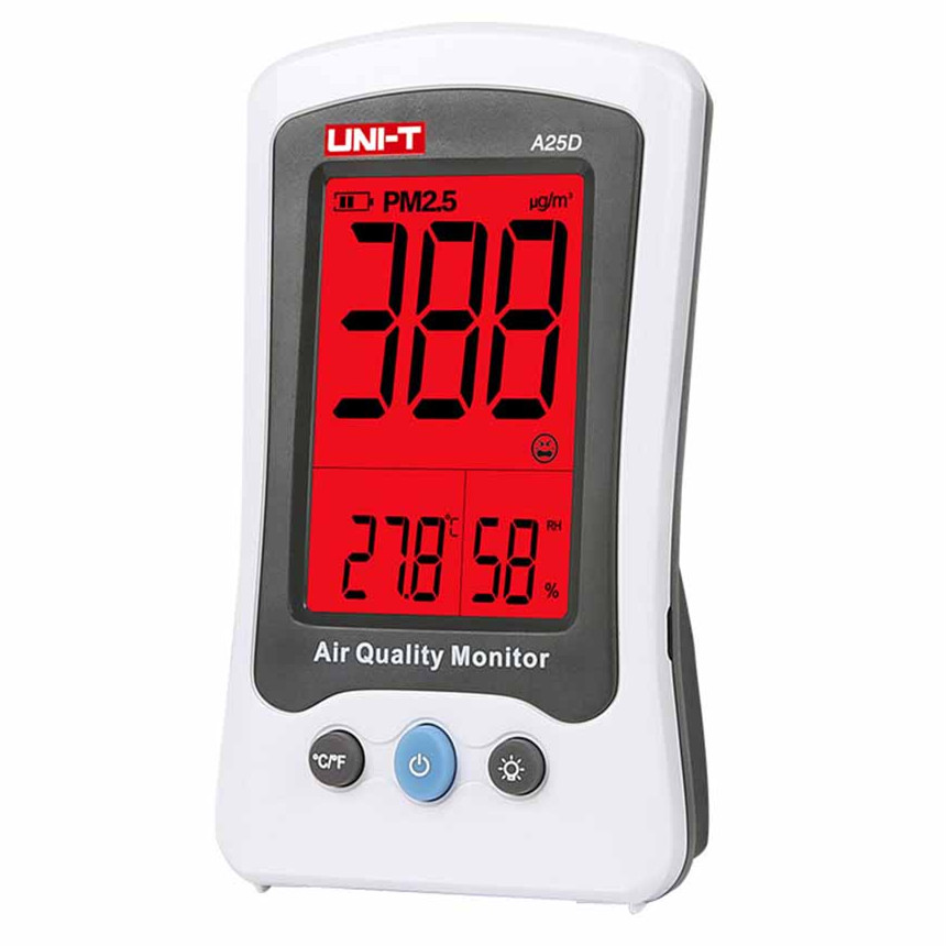 A25D - портативный анализатор концентрации твёрдых частиц произодства компании Uni-Trend. Предназначен для контроля качества воздуха, концентрации твёрдых мелкодисперсных частиц, пыли и других включений в составе воздуха. Используется на производстве, в офисных помещениях, медицинских, образовательных учреждениях, в местах длительного пребывания людей. Прибор измеряет концентрацию твердых мелкодисперсных частиц до 2,5 мкм. Отличительной чертой данного портативного настольного анализатора AD25D являются высокая точность измерения, большой дисплей, на котором отображается концентрация частиц, температура и влажность воздуха, а так-же реализована сигнализация зон допустимой концентрации в виде смайликов и цветовой подсветки. Питание анализатора обеспечивет встроенный аккумулятор.