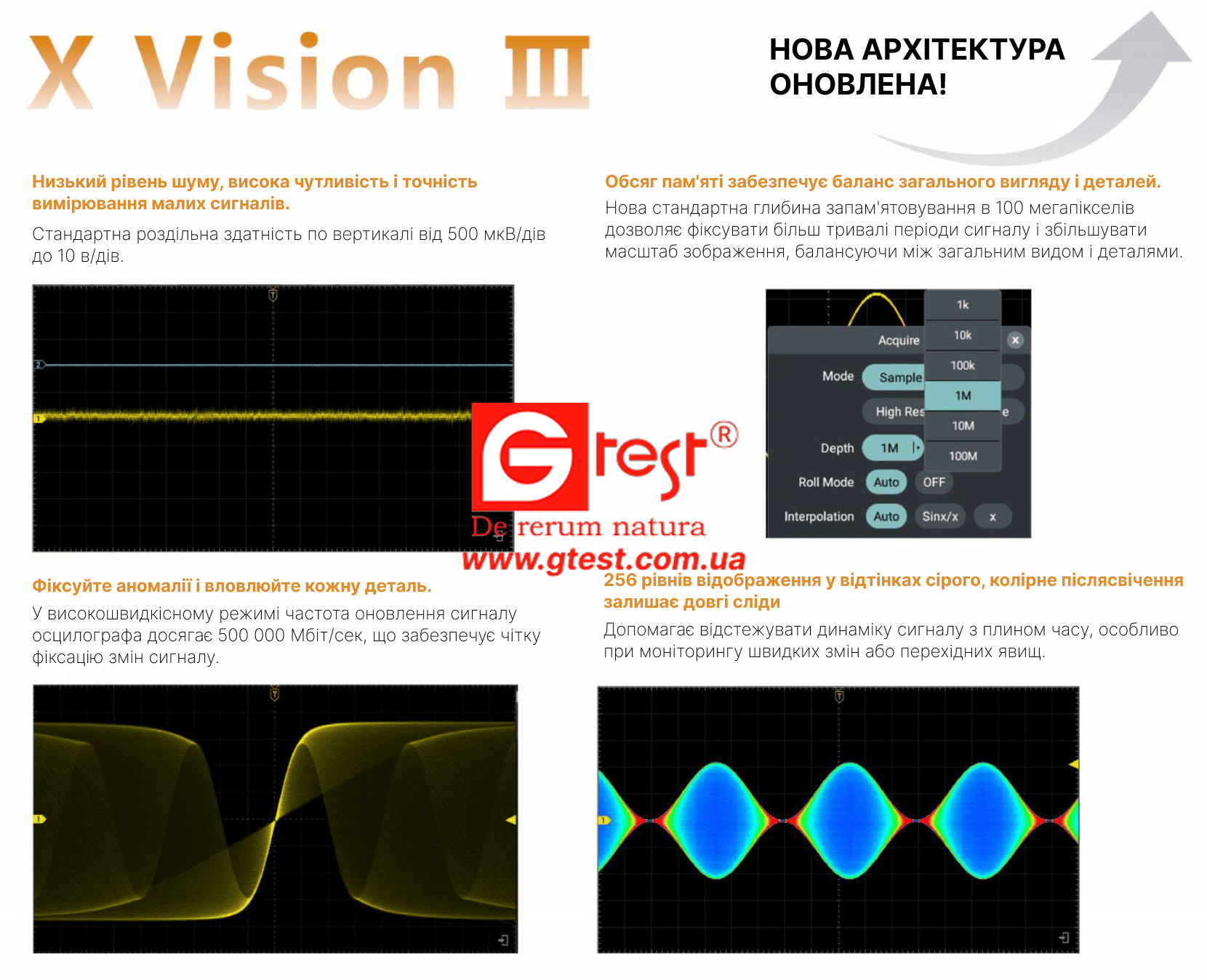- Длина записи 100 млн., частота обновления сигнала до 500 000 осциллограмм/с.
