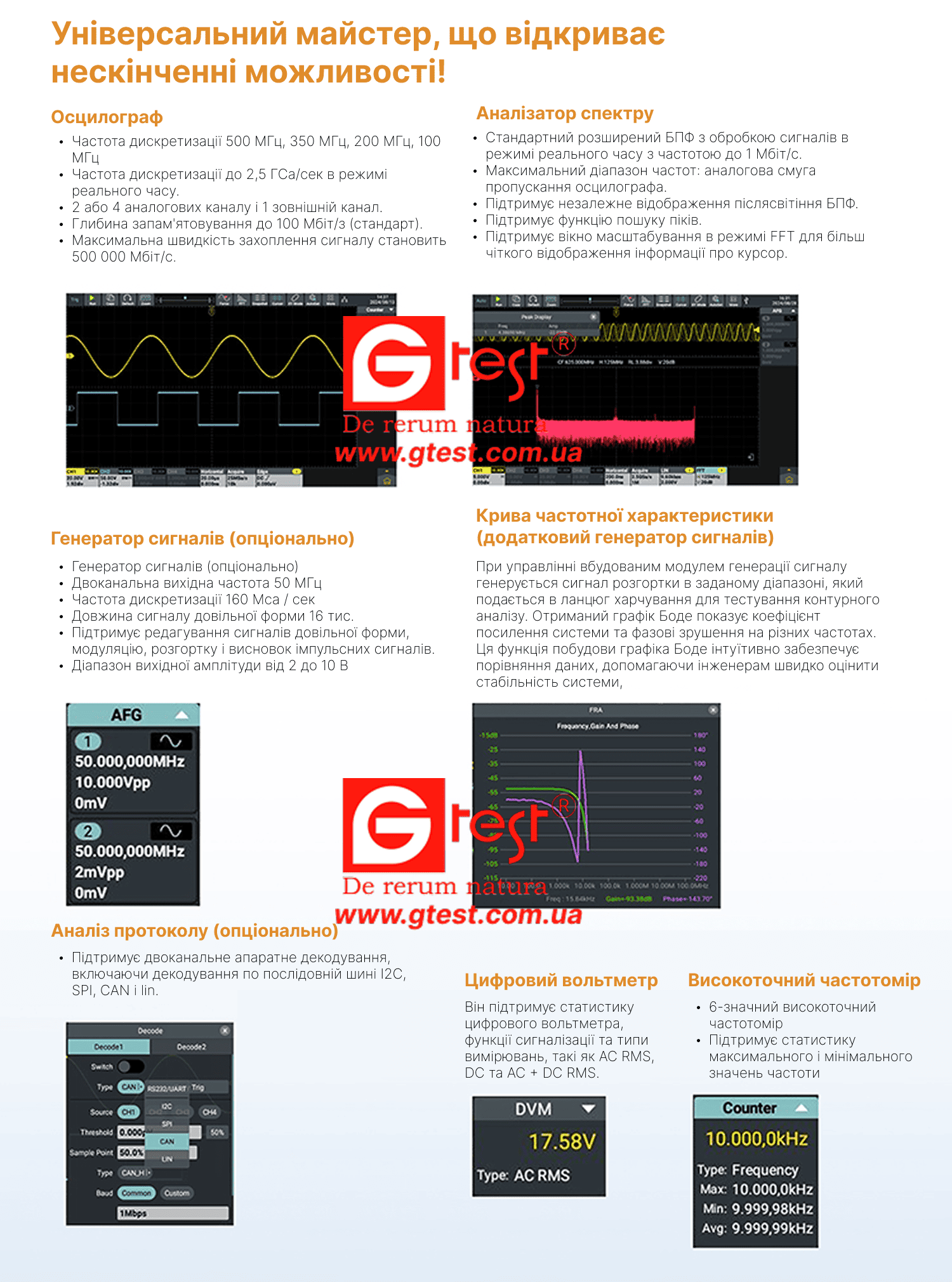 - Включает осциллограф, двухканальный 50 МГц генератор сигналов произвольной формы (опционально), частотомер, вольтметр, анализатор спектра БПФ и анализатор протоколов.