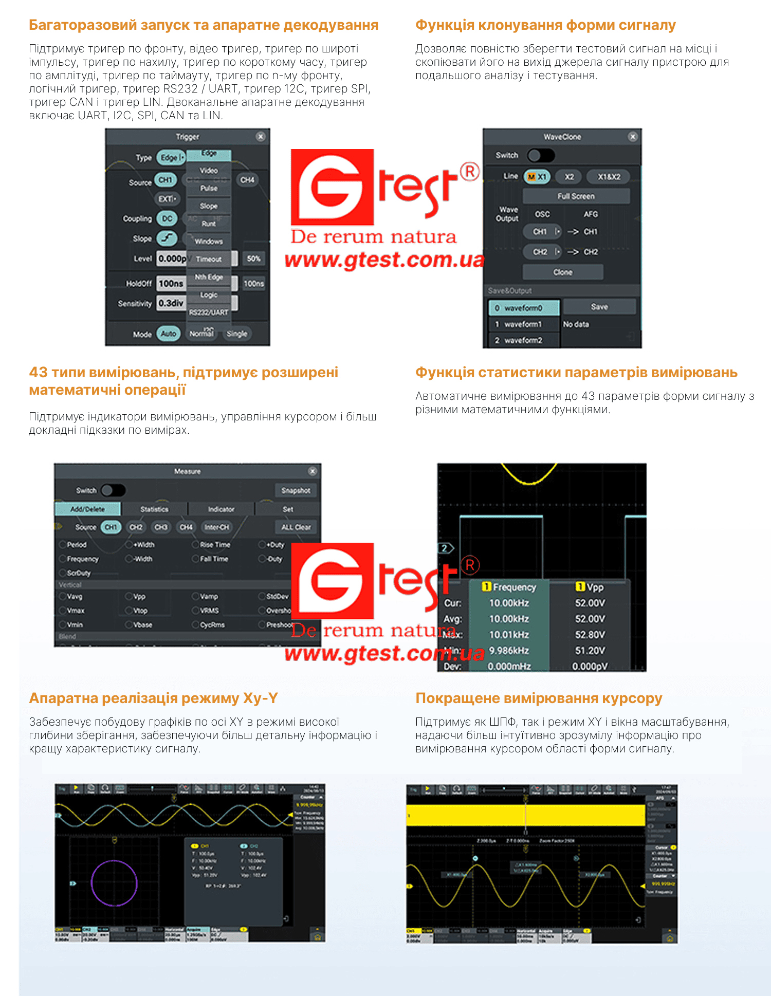 Фронт, Відео, Імпульс, Нахил, Вичерпання, Windows, Тайм-аут, N-й, Логіка, RS232/UART, I2C, SPI CAN, LIN |