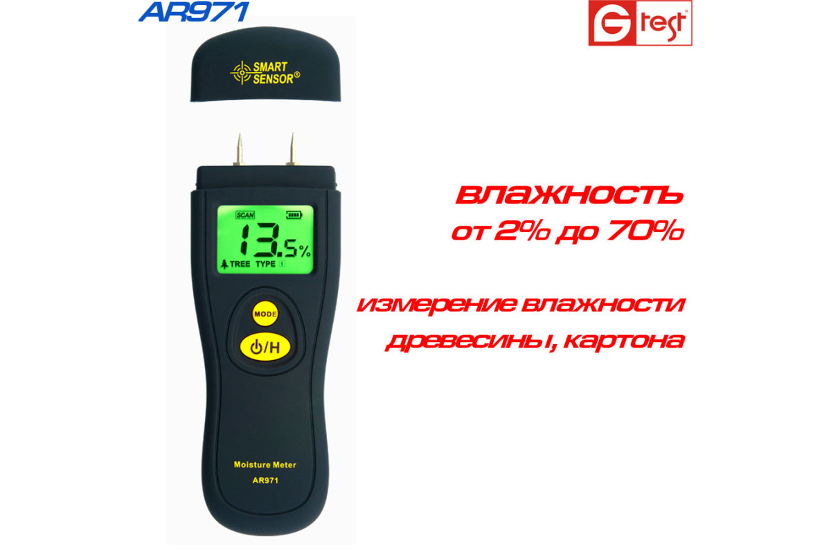 AR971 - влагомер, для определения уровня влажности древесины, производства Smart Sensor. Данный влагомер используется для быстрого и точного измерения влажности 4-х видов древесины. AS971 способен производить измерения влажности в диапазоне от 2% до 70%.