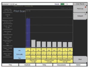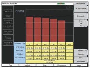 ОТА выводит на экран прибора шесть шифрующих кодов в формате столбиковой диаграммы. Для каждого шифрующего кода, CPICH в dBm, Ec/Io в dB, Ec в dBm и доминанте пилот сигнала в dB – все эти параметры приводятся в табличном формате. Пользователь также может увидеть общую мощность в dBm при измерениях ОТА.