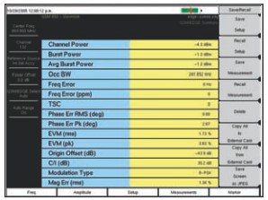 Рис. Опция 41 предоставляет быструю иллюстрацию в табличном виде критических параметров измерений, включая канальную мощность, занимаемую полосу частот, ошибку по фазе и EVM