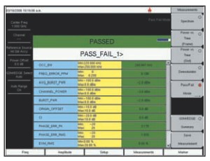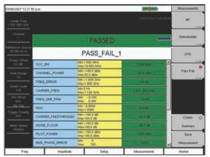 Анализаторы Spectrum Master способны осуществлять автоматизированные измерения “Прошёл/Не прошёл» как для сигналов CDMA, так и EVDO. Результаты тестов представляются на экране прибора в табличном формате с чёткими индикаторами “PASS” или “FAIL”, включающими в себя пороговые значения мин/макс и достоверные результаты. Задействуя программные пакеты Master Software, возможно легко создавать специализированные, нестандартные измерительные алгоритмы, которые затем могут быть легко загружены в память прибора. Под режим «Прошёл/Не прошёл» подпадают все наиболее важные характеристики BTS.