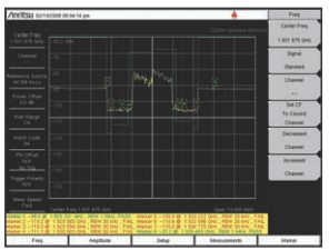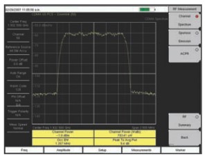 Измерения канального спектра отображают на экране прибора спектр определённого канала в дополнение к цифровым значениям Мощности канала, Занимаемой полосы частот и Усреднённых пиковых значений.