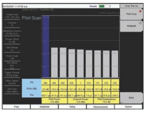 Девять наиболее сильных принятых псевдошумов (PN) отображаются на экране в форме столбиковых диаграмм, при этом номера PN приводятся на нижней части этих диаграмм. Для каждого PN в таблице приводятся его номер, соотношение Ec/Io и Tau. Также можно увидеть характеристики мощности пилотного сигнала, канала, и пилотную доминанту.