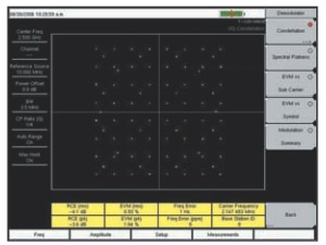 Картинка Созвездия демонстрирует комбинацию демодулированных данных символов по одному фрейму. Выбросы данных могут иметь BPSK, QPSK, 16QAM или 64QAM модуляции. Каждый тип модуляции имеет цветоразностный код. Экранное изображение также представляет параметры RCE (rms) в dB, RCE (pk) в dB, EVM (rms) в %, EVM (pk) в %, ошибку по частоте в Гц, ошибку по частоте в ppm, частоту несущей в Гц и идентификатор базовой станции.