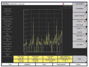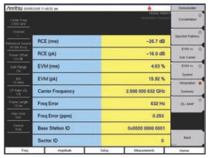 Инженеры и техники имеют возможность быстро просмотреть ключевые параметры измерений на экранных представлениях сводных таблиц различного формата. Сводная информация по результатам РЧ измерений сигналов Mobile WiMAX приводит характеристики канальной мощности, предварительной мощности, выбросов мощности по нисходящему и восходящему каналам. Представление на экране сводной информации по демодуляции сигналов WiMAX приводит данные по RCE (Относительная Ошибка в Комбинации) в величинах rms и peak, Магнитуды Вектора Ошибки (rms, peak), Несущей частоты, Ошибки по частоте в Гц и ppm, а также Идентификатора BTS или отдельного сектора. Сводная информация по сигналам WiMAX представляет собой компиляцию результатов измерений как в радиочастотной области, так и демодуляции.