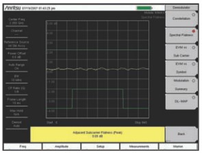Экранное представление Мощности vs Время иллюстрирует временную область сигнала OFDM мобильного WiMAX во фреймах либо 5 ms, либо 10 ms. Различные компоненты мощности vs время сигнала Mobile WiMAX тестируются и представляются на экране прибора как характеристики мощности в канале, начальной мощности, выбросов мощности по восходящему и нисходящему каналам, измеряются в dBm.