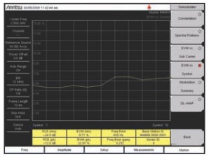 При наличии опции 47 анализаторы Spectrum Master способны демодулировать сигналы OFDM фиксированного WiMAX, после чего выводить на экран прибора детализированные результаты измерений в целях оценки производительности модуляции передатчика. При этом задействуются режимы Комбинации (Созвездия), Спектральной неравномерности, Магнитуды вектора ошибки vs несущая и EVM vs символ.