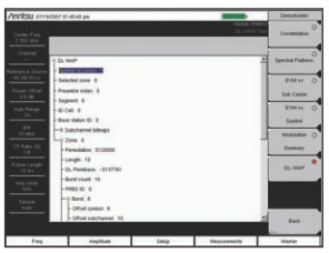 Spectrum Master способен автоматически декодировать информацию DL MAP от несущей Mobile WiMAX, тем самым упрощая тестирование демодулированных сигналов. Экранное изображение DL MAP представляет декодированную информацию из зоны DL MAP, а также и все сопутствующие данные, ассоциированные с каждым индивидуальным пакетным сигналом в какой-либо зоне. Если анализатор спектра настроен на режим ручной демодуляции, то параметры DL MAP от XML файла специфицированы так, как это показано на рисунке.