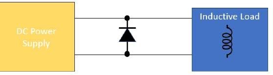 Индуктивная нагрузка может быть источником энергии, которая способна поступить в источник питания и повредить его. Таким образом, источники питания должны быть защищены от индуктивных нагрузок, таких как двигатели, соленоиды и электромеханические реле. Когда источник питания подает напряжение и ток на индуктивную нагрузку, вокруг индуктивной нагрузки создается магнитное поле, которое становится источником потенциальной энергии. Потенциальная энергия U в джоулях равна ½• L•I2, где L — индуктивность нагрузки в генри, а I — ток через нагрузку в амперах. Когда мощность, подаваемая на нагрузку, снимается, ее магнитное поле разрушается и индуцирует ток противоположной полярности подаваемого тока. Ток создает всплеск напряжения, определяемый уравнением V = L•di/dt, которое представляет собой напряжение, развиваемое на индукторе с индуктивностью L, и di/dt, скоростью изменения