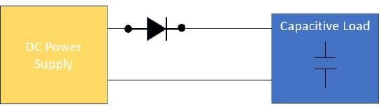 Чтобы защитить источник питания от этой ситуации, добавьте последовательный диод на выходе источника питания, чтобы предотвратить попадание обратных токов от емкостных нагрузок в источник питания. Подключите диод, как показано на рисунке 2. Пока диод смещен в прямом направлении, ток будет течь из источника питания и питать нагрузку. Когда напряжение источника питания выключается или падает до значения ниже напряжения на емкостной нагрузке, диод становится обратносмещенным и предотвращает разряд обратного тока от емкостной нагрузки в источник питания.