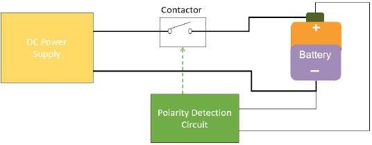 с батареями, движущимися по производственным линиям. Безопасная система тестирования аккумуляторов нуждается в схеме определения полярности и контакторе. Схема определения полярности предотвращает замыкание контактора и подачу питания на неправильно подключенную батарею. На. рисунке 3 показана схема защиты батареи от неправильной полярности