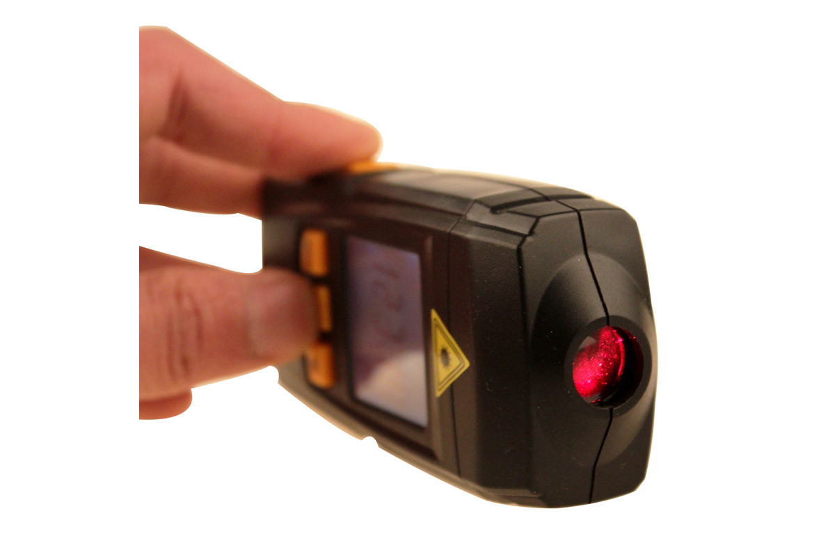В основу измерения скорости вращения положен принцип подсчета количества импульсов отражённых от вращающейся метки за единицу времени. В комплект поставки включены светоотражающие полосы. Бесконтактный тахометр часто применяют для контроля оборотов коленчатого вала двигателей, или частоты вращения механизмов технологических машин и агрегатов.