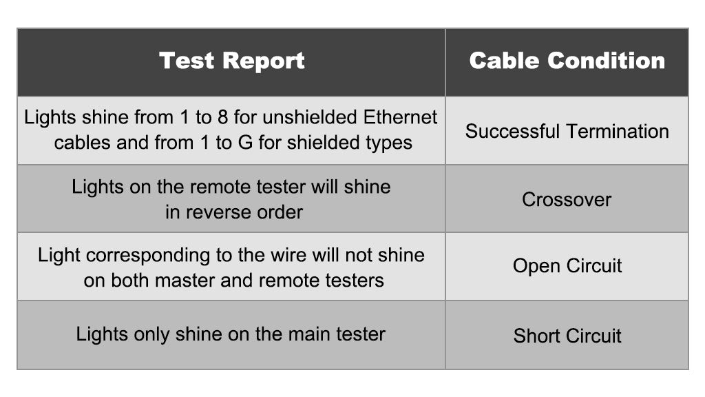 Базовый тестер сетевых кабелей — это работающее от батареи портативное устройство с источником электрического тока. Типичный тестер сетевых кабелей проверяет, может ли кабель Ethernet успешно передавать сигнал. Он может помочь определить, правильно ли подключены провода кабеля. Базовый тестер сетевых кабелей может проверить, есть ли в сетевом кабеле короткое замыкание, перекрестное соединение или обрыв цепи.