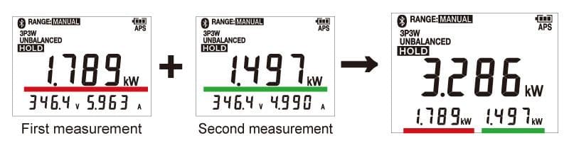 CM3286-50 может измерять несбалансированную мощность в 3-фазной/3-проводной цепи, измеряя однофазную мощность дважды, а затем автоматически складывая результаты. (Прибор также может измерять 3-фазные/4-проводные цепи в трех отдельных измерениях)