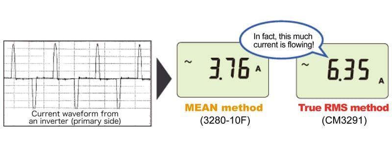 Измерение истинного среднеквадратичного значения обеспечивает точные отображаемые значения даже при измерении искаженной формы сигнала, например, от устройства с инвертором или импульсного источника питания.