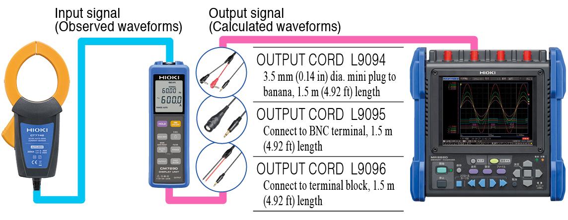 Подключив датчик переменного/постоянного тока к дисплейному блоку CM7290, а дисплейный блок — к регистратору данных или Memory HiCorder, вы можете выводить: