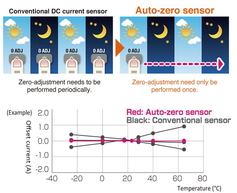Поскольку температурные колебания вызывают смещение нулевой точки при использовании обычного датчика постоянного тока для измерения постоянного тока, необходимо периодически выполнять регулировку нуля при записи данных в течение длительного периода времени с помощью такого датчика. Этот недостаток вызван эффектами элемента Холла, который обычные датчики постоянного тока используют для обнаружения тока. Новые датчики тока с автообнулением Hioki включают новую схему компенсации смещения на основе переключения, разработанную для решения этой проблемы. Новая конструкция минимизирует смещение нулевой точки, что позволяет регистрировать значения постоянного тока в течение длительного периода времени без необходимости периодической регулировки нуля.