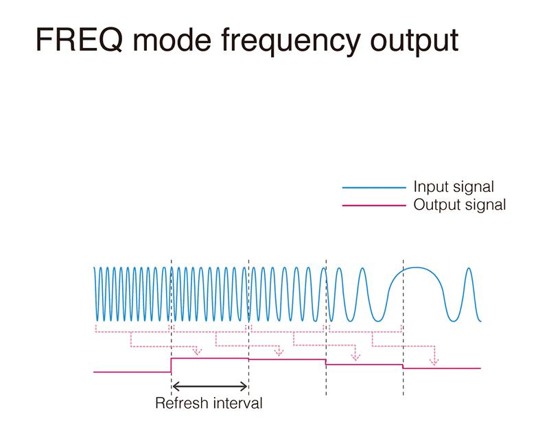 В этом режиме дисплейный блок CM7290 вычисляет частоту формы тока для тока, протекающего в проводе, к которому был применен датчик переменного/постоянного тока с указанным пользователем интервалом. Затем он выводит результат в виде сигнала напряжения со временем обновления выхода 0,2 с (БЫСТРО), 0,2 с (НОРМАЛЬНО) или 3 с (МЕДЛЕННО). В этой конфигурации CM7290 можно использовать в таких приложениях, как проверки колебаний частоты и испытания компрессоров и двигателей.
