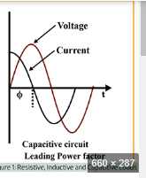 Конденсаторы вызывают опережающий ток. Ток достигает максимума и пересекает ноль раньше в каждом полупериоде, чем напряжение на конденсаторе на 90 градусов.