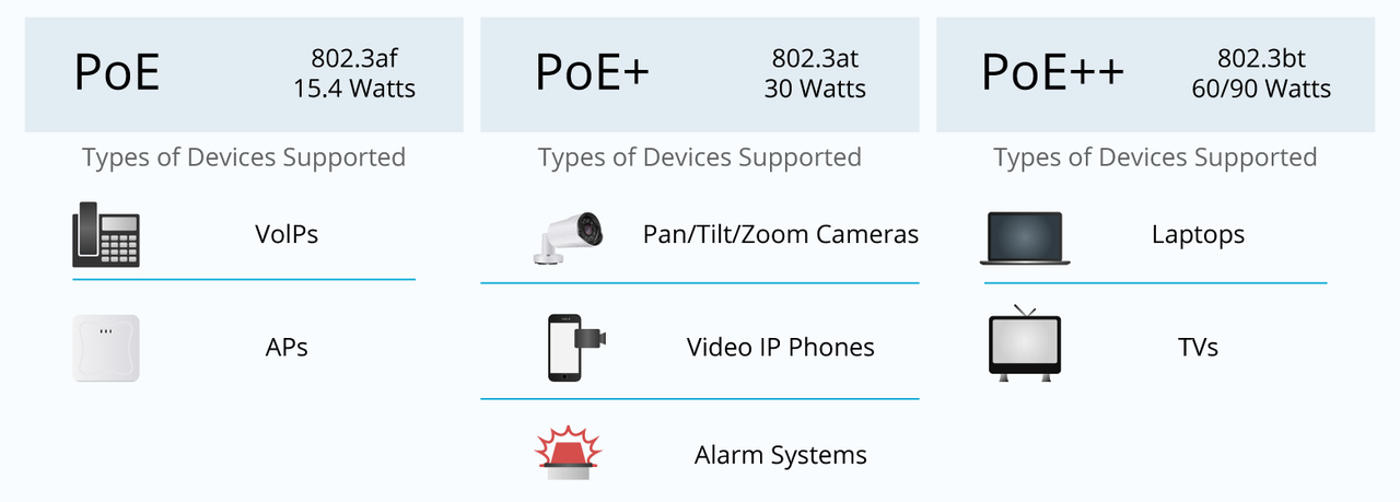 Существует несколько стандартов PoE, каждый из которых имеет различную мощность: