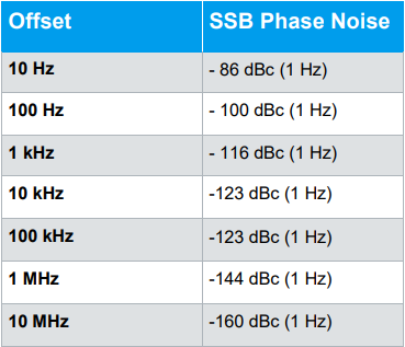 Информационные листы генераторов сигналов и анализаторов спектра обычно содержат таблицу со значениями фазового шума на различных частотах смещения. Значения верхней и нижней боковых полос считаются равными.