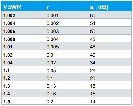 Таблица 5-2: Преобразование КСВ в коэффициент отражения r и обратные потери ar