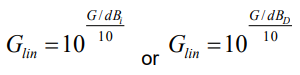 Антенны обычно направляют электромагнитное излучение в определенном направлении. Коэффициент усиления мощности G, возникающий в результате этого в приемнике, указывается в децибелах по отношению к эталонной антенне. Наиболее распространенными эталонными антеннами являются изотропный излучатель и диполь λ/2. Усиление указывается в дБи или дБД. Если коэффициент усиления мощности необходим в линейных единицах, для преобразования можно использовать следующую формулу: