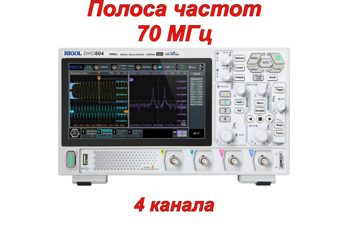 RIGOL DHO804 — это высокопроизводительный четырехканальный осциллограф с полосой пропускания 70 МГц, частотой дискретизации 1,25 Гвыб/с, 12-битным АЦП, низким уровнем шума, глубиной памяти 25 МБ и сенсорным дисплеем 17,8 см (1024×600 пикселей). Скорость захвата составляет до 1 000 000 осциллограмм/с (в режиме UltraAcquire). Последовательные декодеры для I²C, SPI и RS232/UART уже включены!