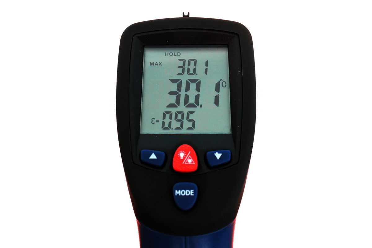 Установив батарею (щелочная 9В-я батарея типа "Крона"), входит в комплект, и нажав на кнопку измерения, получили измерение температуры поверхности, в данном случае -стола. На дисплее индицируется текущее значение измеренной температуры, максимальное за сеанс измерения (можно установить минимум, среднее, а так же разницу между значениями). Ниже индицируется значение установленного коэффициента излучательной способности тела. Кнопки интуитивно понятные, врядли вам прийдется обратится к руководству, к слову русскоязычному, что бы разобраться в их назначении. Я к примеру открыл его только тогда когда нужно было подключить пирометр к ПК.