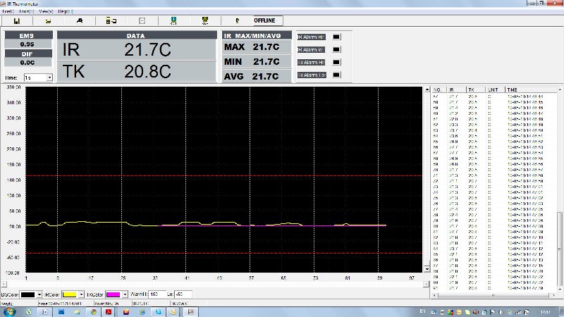 Ниже представлен скриншот программы IR Thermometer. Позволяет строить график и формировать таблицы используя результаты измерения как бесконтактного так и контактного термометров.