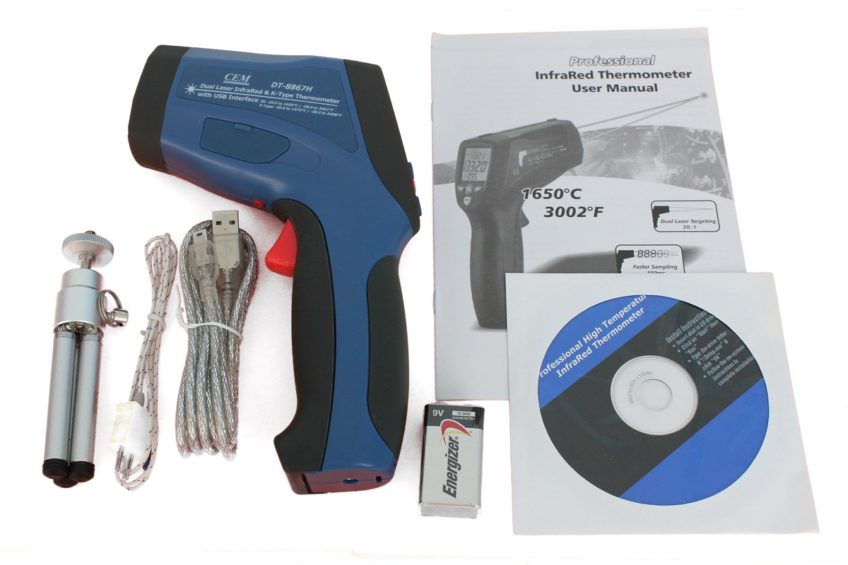 Пожалуй, начнем с комплектации пирометра DT8867H. Пирометр поставляется в пластиковом кейсе, комплектация предусматривает наличие термопары К-типа для выполнения контактных измерений, треноги для удлобства фиксации пирометра, кабель USB, CD с программным обеспечением. Аксессуары расположены удобно на своих местах, приятно, что даже не главная деталь - кабель USB очень качественный с хорошим экраном.