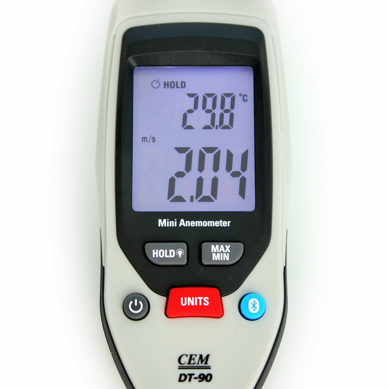 Термоанемометр оснащен большим двухстрочным ЖК дисплеем с подсветкой, обеспечивающим отображение значений скорости воздушного потока, температуры и единиц измерений. К особенностям анемометра DT90 относится высокое разрешение  - 0,01 м/с, удержание текущих значений, индикация MAX, MIN, большой выбор единиц измерения, автоматическое отключение питания.
