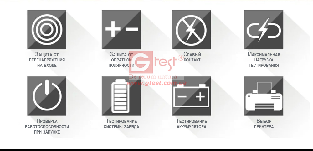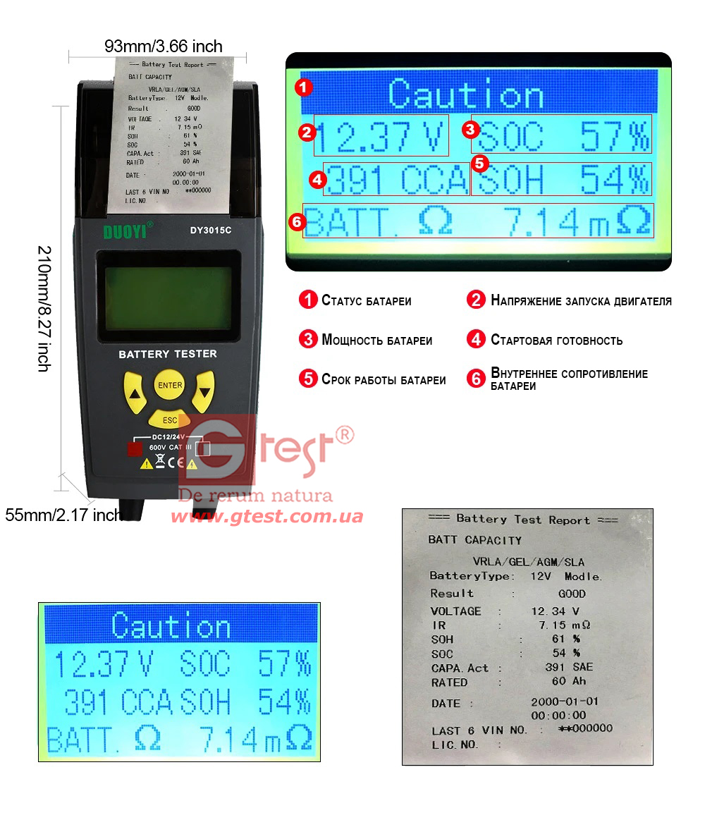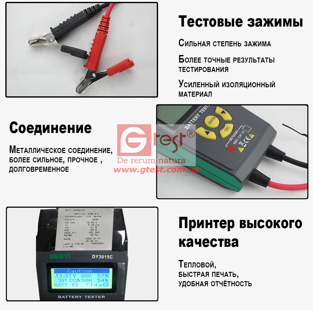 - Функции: тестер автомобильных аккумуляторов, тест проворачивания, тест зарядки, просмотр данных, печать данных, экспорт данных на компьютер.