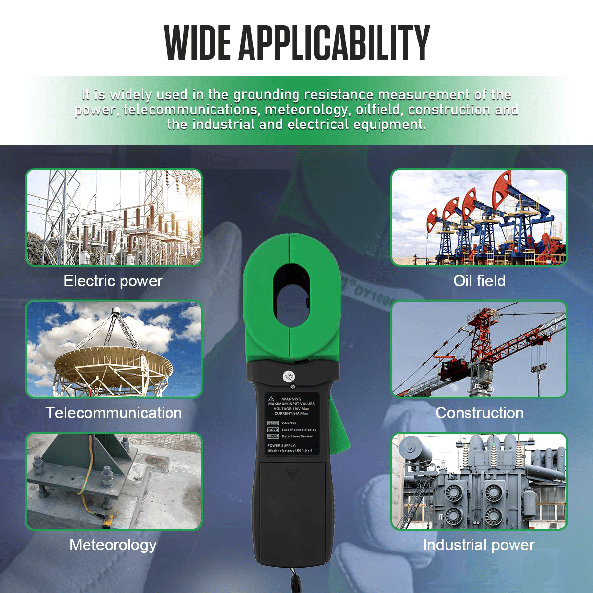 Тестер сопротивления заземления Clamp-On является крупным прорывом в традиционном измерении сопротивления заземления. Он широко используется при измерении сопротивления заземления в энергетике, телекоммуникациях, метеорологии, нефтяной промышленности, строительстве, а также в промышленном и электрическом оборудовании.