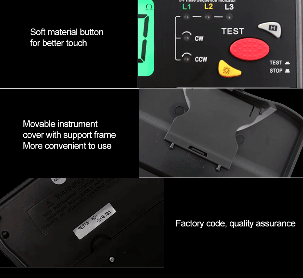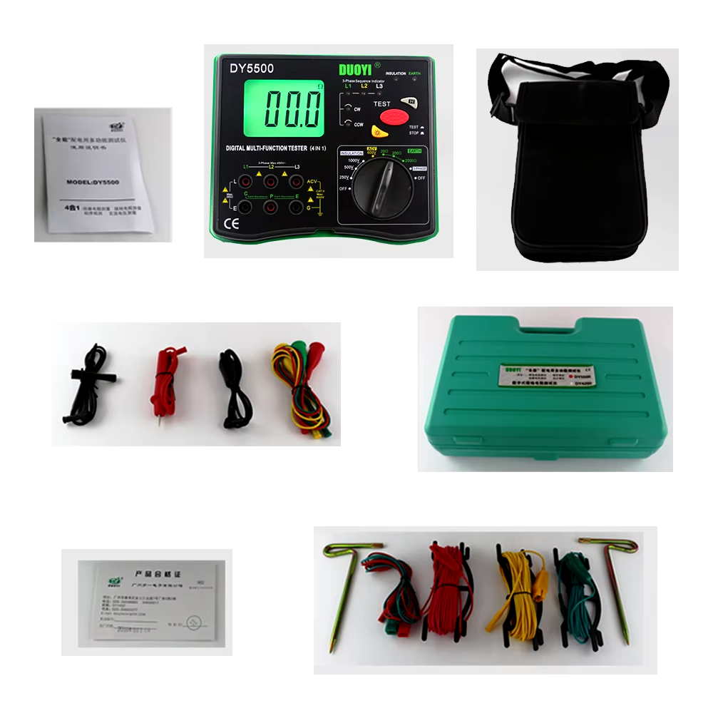 Многофункциональный прибор марки DY5500 может измерять сопротивление заземления, сопротивление изоляции, переменное напряжение и последовательность фаз. Как новое поколение электроизмерительного прибора, который мы успешно разработали недавно. Он нацелен на приятный и модный дизайн, более сильные функции, которые проще в использовании и более надежны. Прибор и принадлежности находятся в ящике для инструментов. Его можно использовать для проверки сопротивления изоляции и сопротивления заземления энергосистемы, электрооборудования, оборудования молниеотводов, а также для измерения переменного напряжения и проверки последовательности фаз.