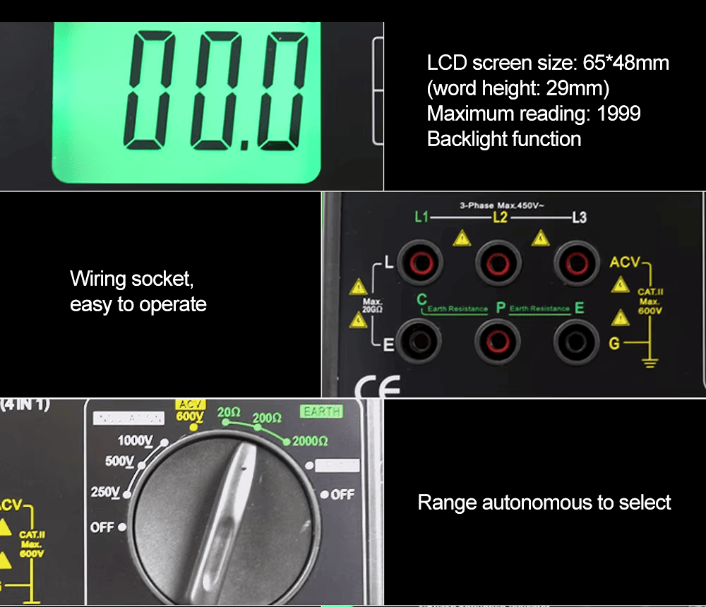 Тестер Изоляции + Тестер Заземления + Вольтметр + Индикатор Фаз от 0,01 Ом до 2000 Ом