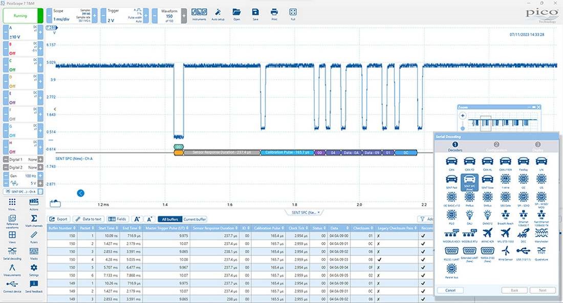 Г-н Тревор Смит, менеджер по продукции в Pico Technology, выразил свое волнение по поводу этого новейшего декодера: «Автомобильная промышленность приняла последовательные стандарты последовательной связи, включая CAN, CAN FD, CAN XL, CAN J1939, FlexRay и LIN. Удовлетворение растущих потребностей наших клиентов является нашим главным приоритетом, и мы поддерживаем каждый из этих стандартов в PicoScope 7. Добавление нами декодера SENT SPC подтверждает нашу приверженность предоставлению инновационных решений, которые позволяют инженерам и техникам решать проблемы, возникающие в сложных электронных системах современных транспортных средств». Декодер протокола SENT SPC доступен с версии 7.1.8 раннего доступа PicoScope 7 и доступен для бесплатной загрузки с веб-сайта Pico Technology.