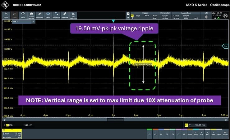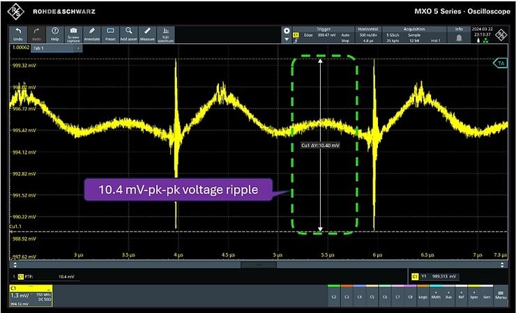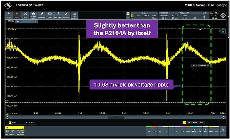 Повторение нашего теста с использованием пробника Picotest P2014A-1X позволило получить форму выходного сигнала, показанную на рисунке 6. Это обеспечивает еще более низкий размах пульсаций напряжения, составляющий всего 10,40 мВ.