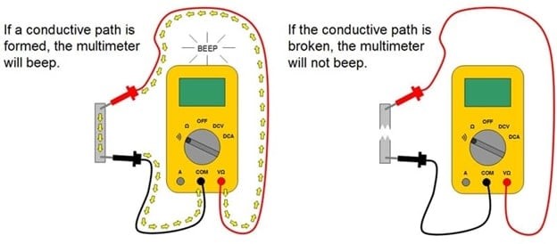 3. При наличии полного пути (непрерывности) тестер непрерывности подает звуковой сигнал. При отсутствии непрерывности (разомкнутой цепи) тестер непрерывности не подает звуковой сигнал.